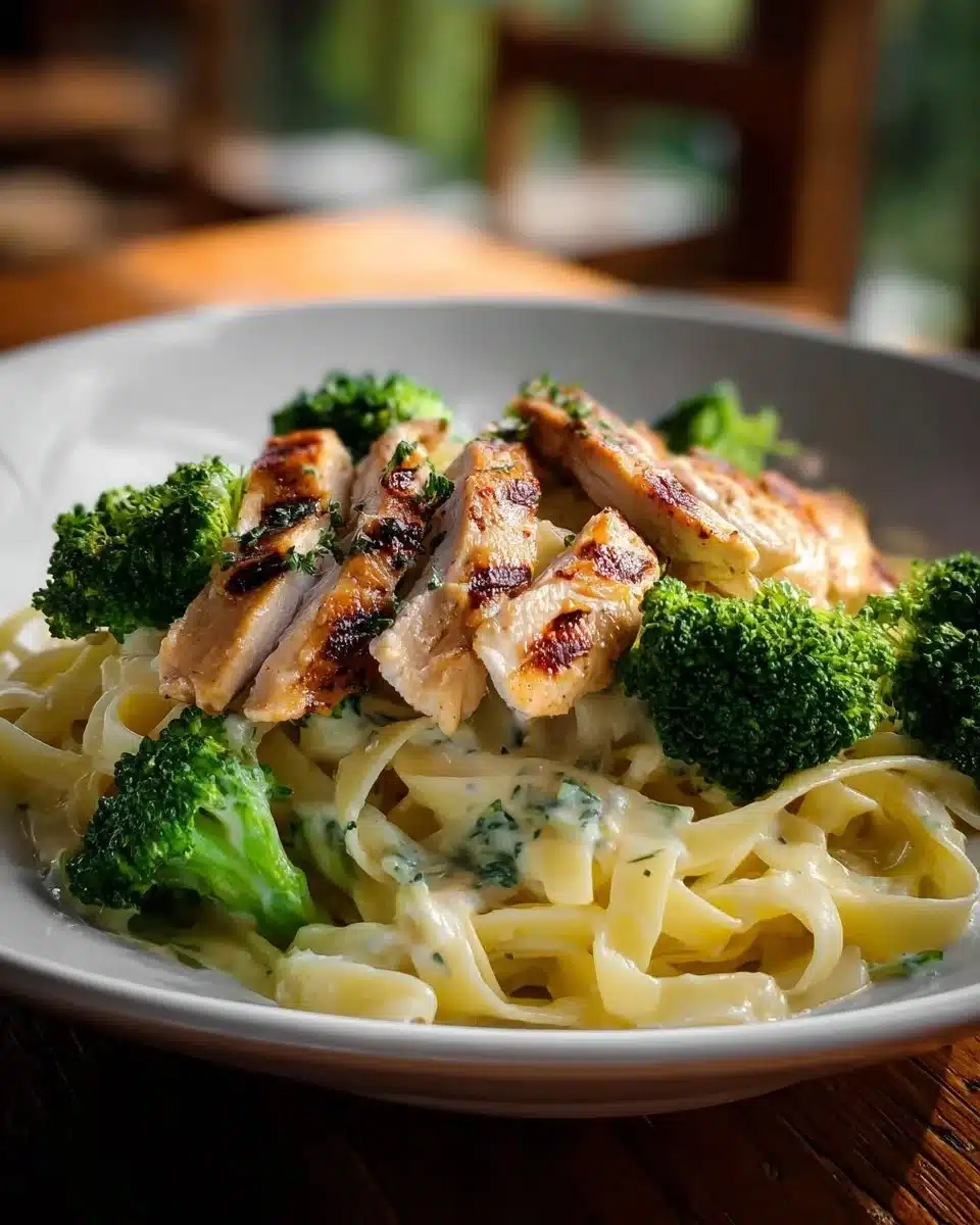 Serve Chicken Broccoli Fettuccine Alfredo in a large bowl or on individual plates. You can add extra Parmesan cheese on top for more flavor. Pair it with a side salad or garlic bread for a complete meal. This dish is best enjoyed warm, so serve it right after cooking!