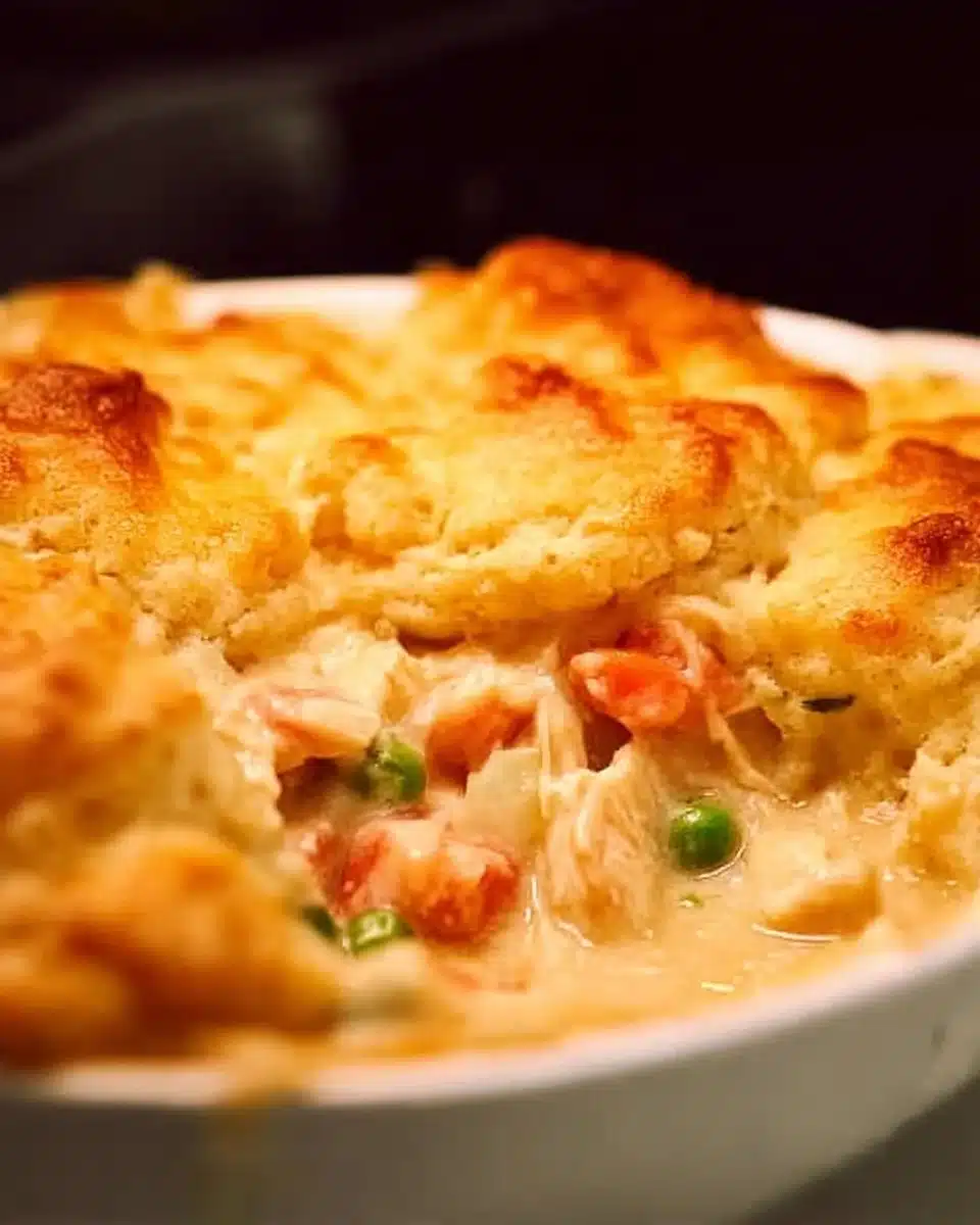 A comforting dish of tender chicken, mixed vegetables, and a golden biscuit topping, perfect for family dinners or gatherings.