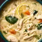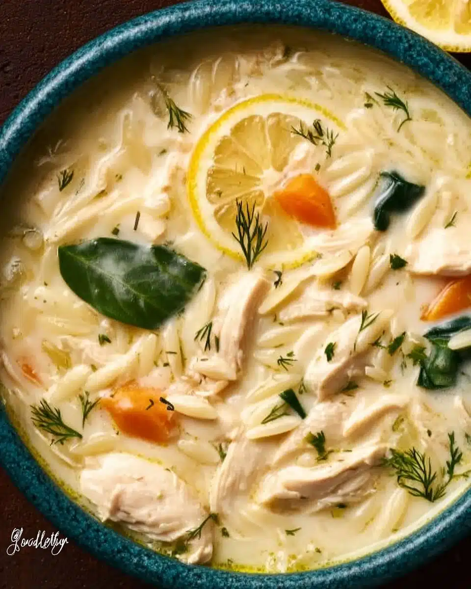A warm and comforting soup that combines tender chicken, bright lemon, and creamy goodness, perfect for busy weeknights or cozy meals.
