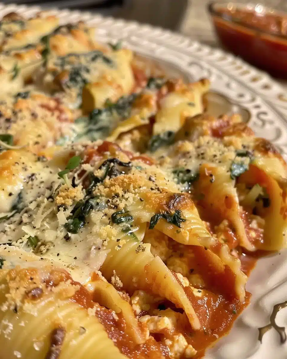 - Place the stuffed shells in the dish and cover with remaining marinara sauce.