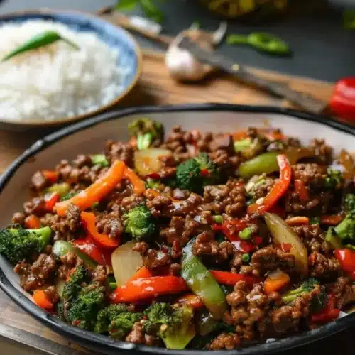 Ground Beef Stir Fry is a fast and flavorful dish that brings the vibrant colors and bold tastes of Asian cuisine right to your dinner table. This recipe is perfect for those busy weeknights when you want a satisfying meal that doesn’t take hours to prepare. The tender ground beef, paired with a medley of crisp vegetables and aromatic ginger and garlic, creates a colorful and nutritious dish that the whole family will love. It’s not just easy to make; it’s also customizable to suit your taste preferences. Whether served over noodles or rice, this dish guarantees a hearty meal that will leave everyone asking for seconds.
