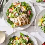 - Add grilled chicken breast, cherry tomatoes, cucumbers, and red onion to the salad.