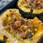 A delicious and visually stunning fall dish, perfect for family dinners and holiday gatherings, filled with a savory stuffing that complements the sweetness of acorn squash.